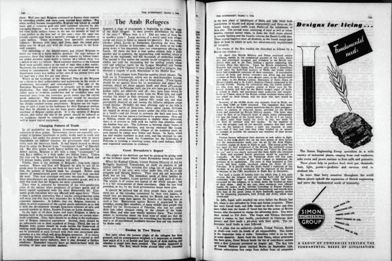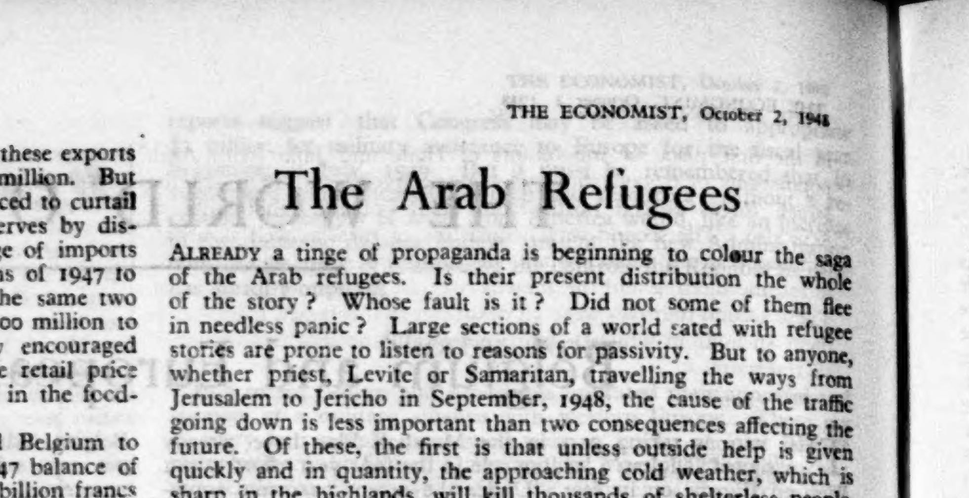 THE FULL COPYRIGHTED STORY CAN BE READ HERE: LINKIn all, Arab refugees from Palestine number about 360,000. The bulk are in Transjordan, which was by mid-September housing 160,000 and spending £8,000 a day on bread alone. (These figures should be set against those for its population and annual local revenue, which are about 340,000 heads and about £1,200,000 respectively.) In Palestine itself, the few who have got as far as the Jordan valley are relatively well off; they have been tented by the Arab Legion, can draw water from the Wadi Qilt, and could weather the winter in their sheltered spot below sea level. The many who are still in the Judean hills could not, and must presumably descend on and swamp the hitherto adequate camps round Jericho.